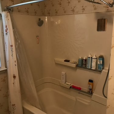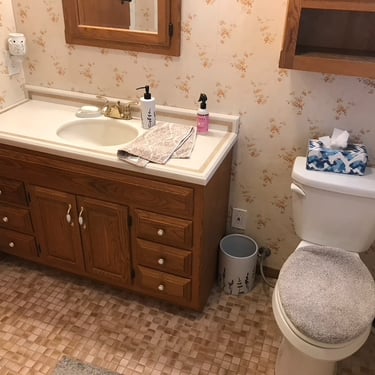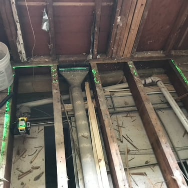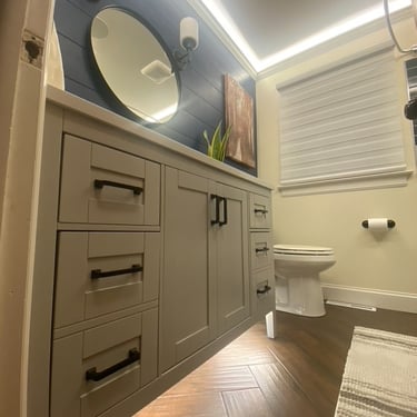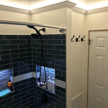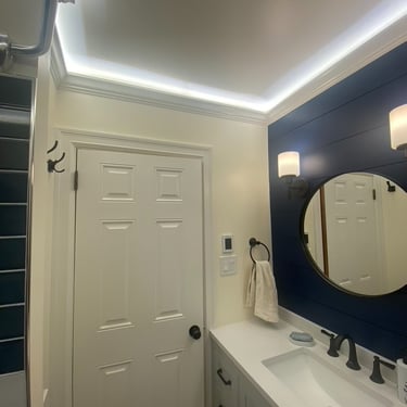 This bathroom was long overdue for an update. The wood accents, floor tile, popcorn ceiling, and tub insert had to go. This one was a complete gut, all the way down to the floor joist. The entire floor was WAY out of level and had to be shimmed up. We reframed the back wall to be plumb as well as to accommodate (2) new shower niches. After the framing was done, we set the tub. All the electric and plumbing was replaced. In the process of the rough-in, wiring was installed for the heated floor, low volt lighting, and in ceiling speaker. We installed wood look tile after installing heated floor for those cold winter mornings and nights. Tiled the shower, installed the rest of the fixtures and replaced the window. One of the last things to get installed was the crown molding for the cove lighting. Then came the fun part, installing the low volt lighting. We installed LED strip lighting in the crown molding cove, the shower niches, and under the vanity. All the lighting is on a scheduled dimmable motion sensor that dims the lights at night and in the morning, so you have no need to touch the lights at all when you're half asleep and just need to use the bathroom. This project turned out great! What a difference!