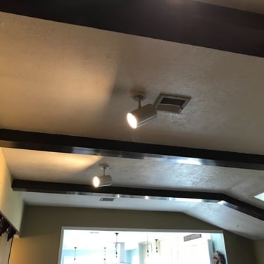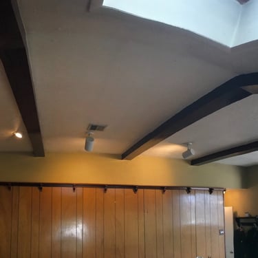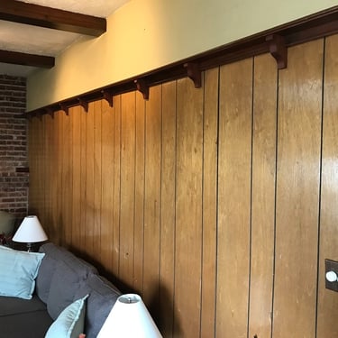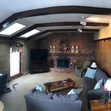 This living room was incredibly outdated due to the combination of wood paneling, yellow stucco wall, large metal tract lights and brick and brick and mortar fireplace. The first step was to get rid of the paneling and shelf running along the wall, sand down and skim coat the stucco and install sheetrock. Then we removed the existing lighting and installed a few more recessed lights. Even with only these few little updates, after some painting, this space looks immensely better than before