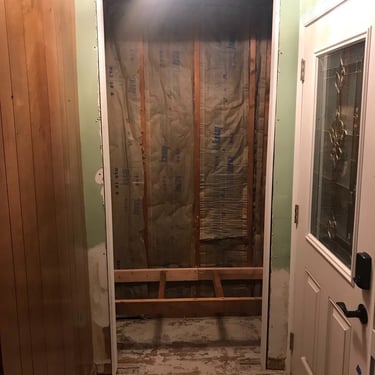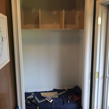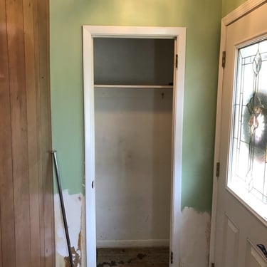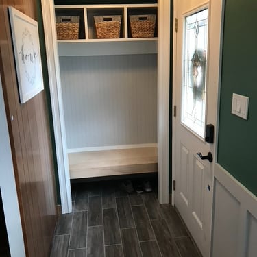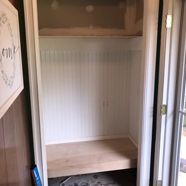 Converted this small little coat closet that barely got used, and was annoying to open up, into an enlarged cased opening that has easy access and lots of storage. Started by removing the door jamb and re-framing the opening as big as possible. Re-insulated, installed framing for bench, and re-sheetrocked. Installed a custom made shelving unit to accommodate 3 baskets for storage, as well as a full shelf on top. Installed bead board, hooks for coats, and last but not least, a stained birch plywood bench. Finished the whole project off by installing gray wood look tile flooring and large decorative trim to the opening.